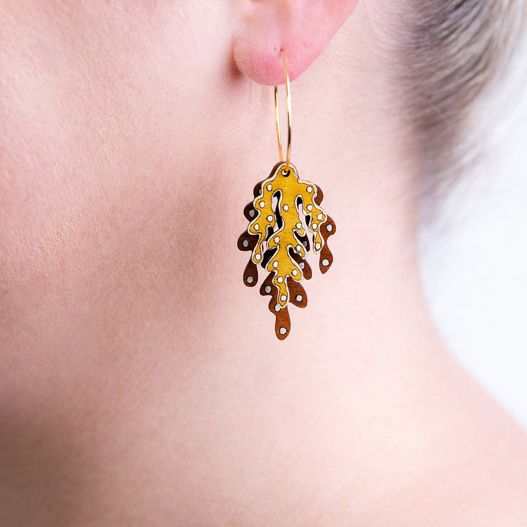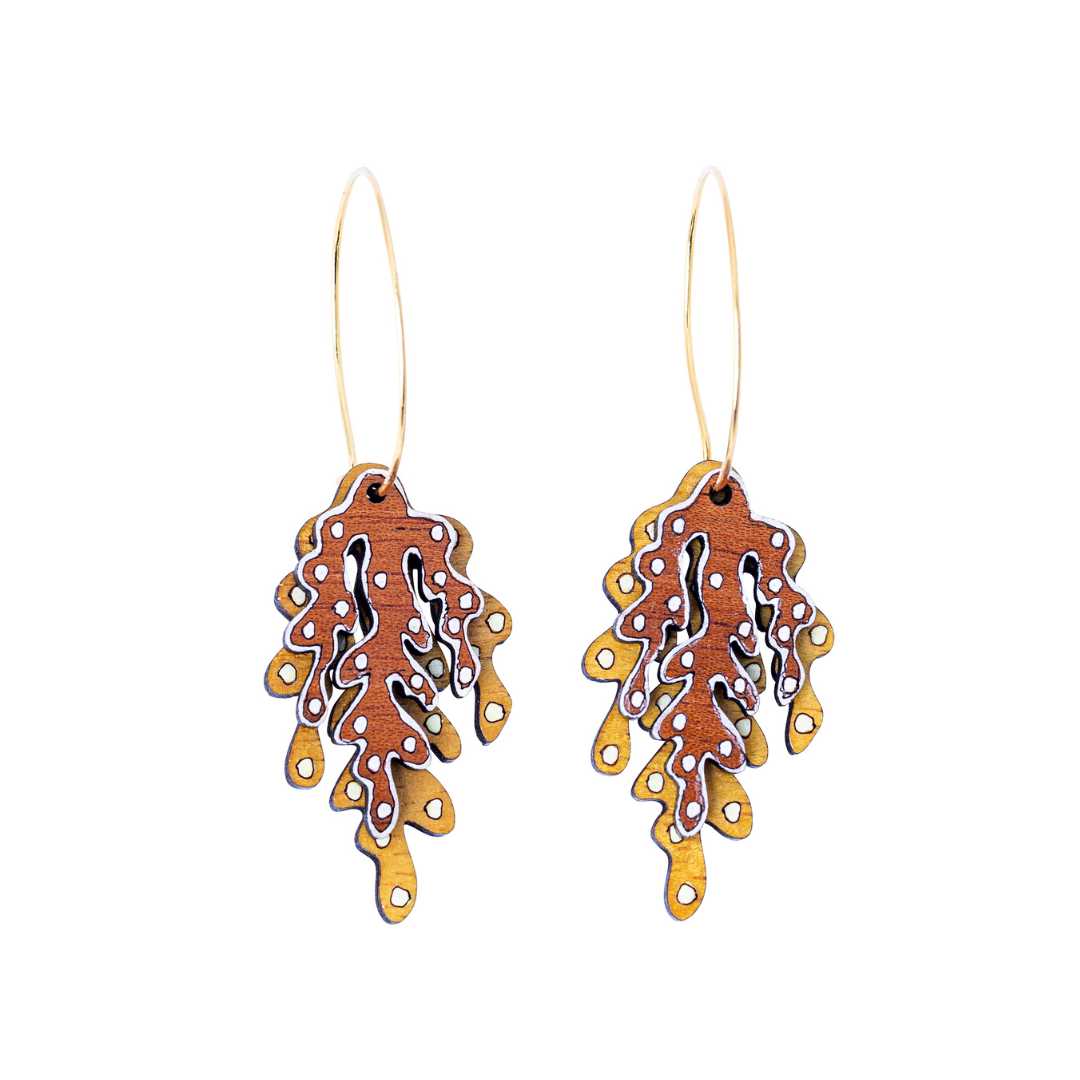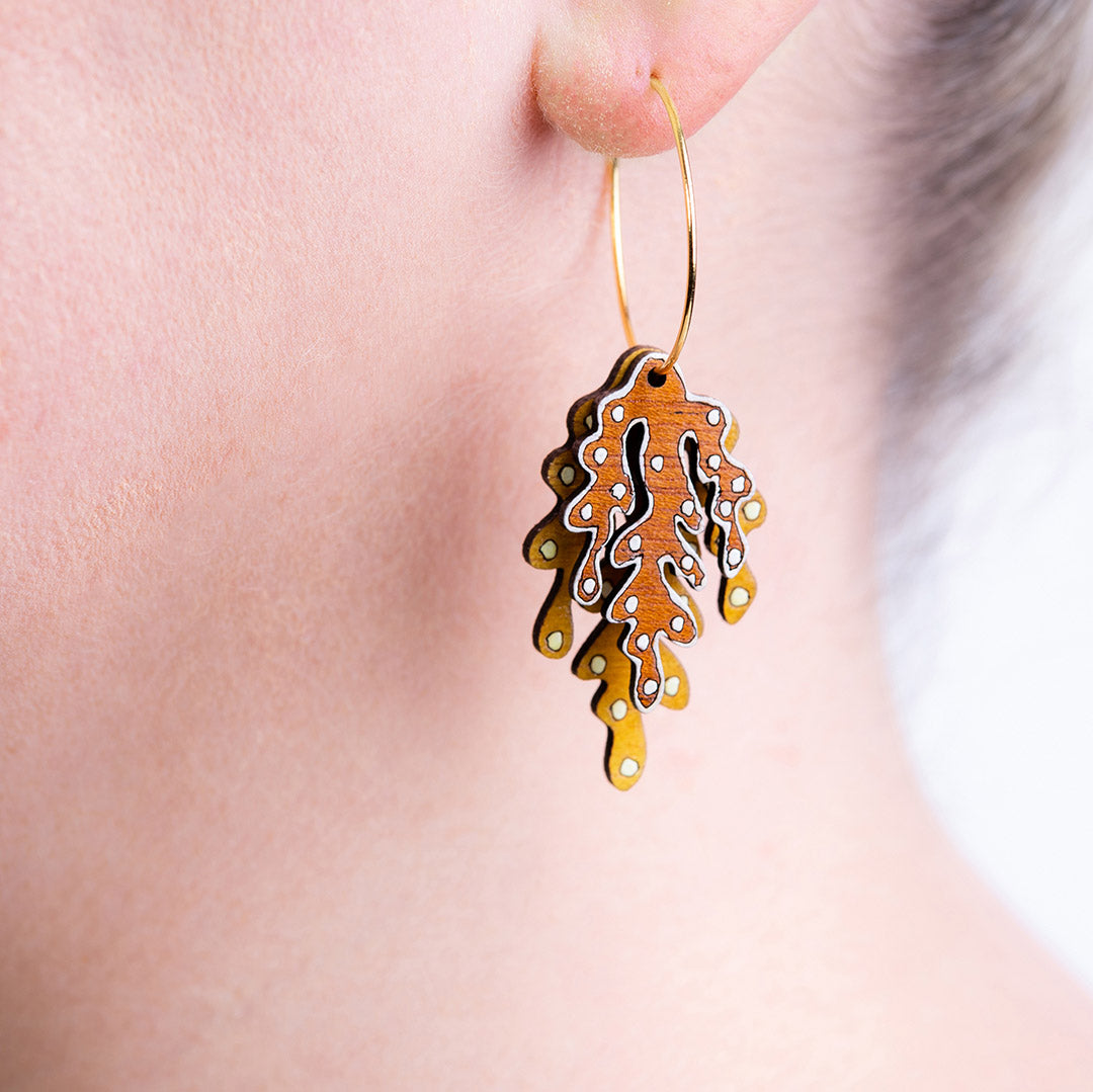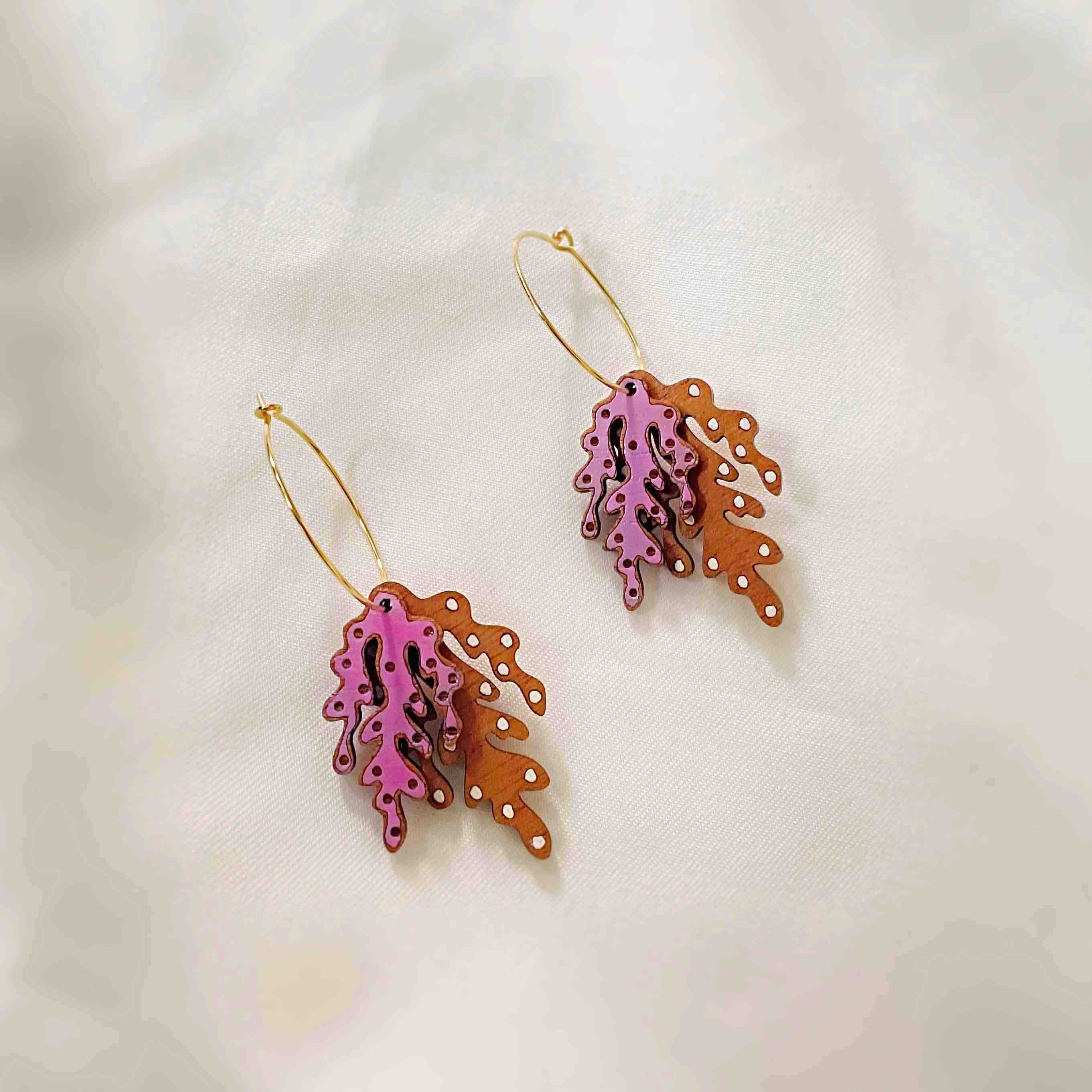 Korallenfarbene, umweltfreundliche Ohrringe aus recyceltem Holz und Gold
