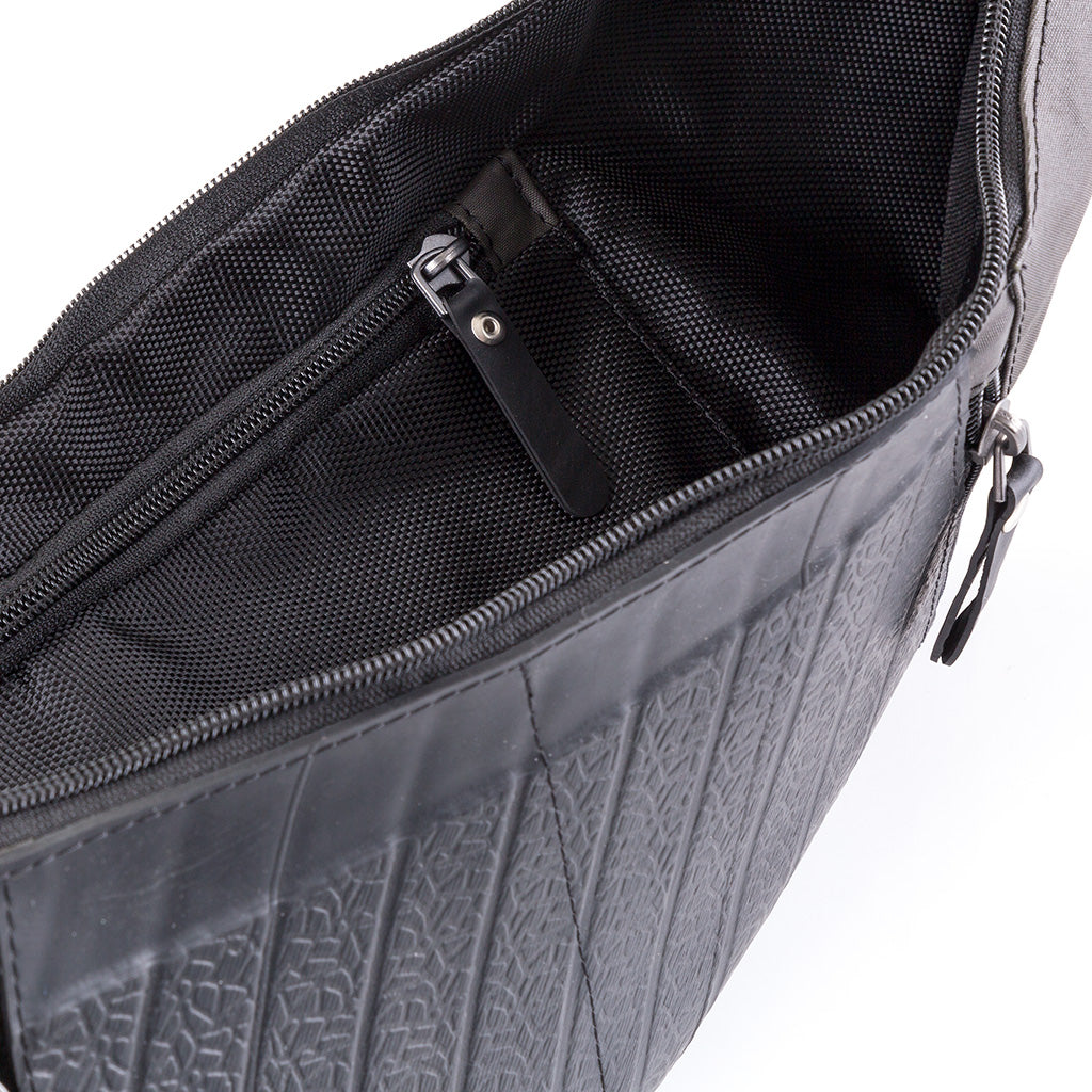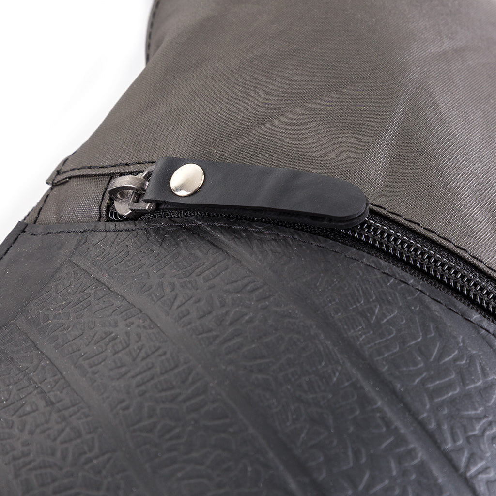 Stattdessen werden sie von Transportunternehmen in Indonesien zurückgewonnen, um zu Taschen, Schmuck und anderen Accessoires verarbeitet zu werden. Die vielfältige Textur des Gummis verleiht jedem Artikel einen unverwechselbaren Charakter und obwohl wiederverwendet, bleibt das Material äußerst strapazierfähig.